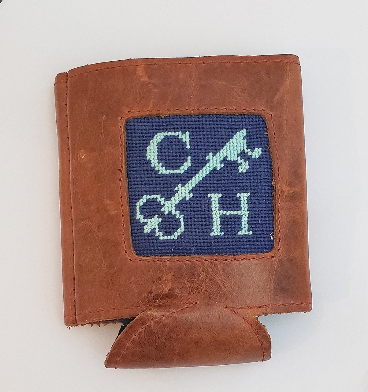 Our monogram can cooler will keep your drink cold on a hot summer day. This Smathers and Branson can cooler is hand-stitched needlepoint with an Italian full grain leather exterior and neoprene liner.